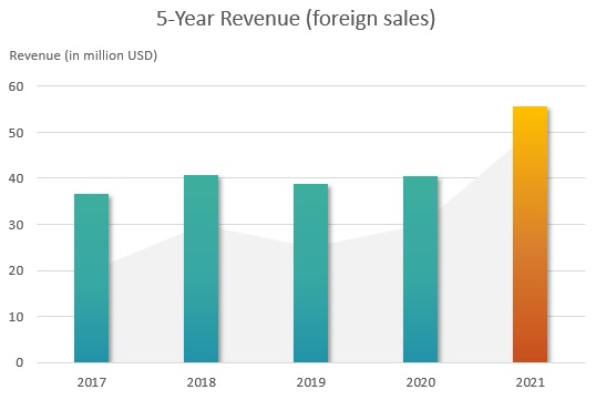 After overcoming numerous difficulties to keep up the production for lots unexpected orders and make sure the goods are shipped on schedule, we are proud to share with you – Transpak’s annual foreign sales in 2021 hit a record high USD55.6 million with 36.64% growth. Please refer to the following drawing of the past 5-year history sales we made.