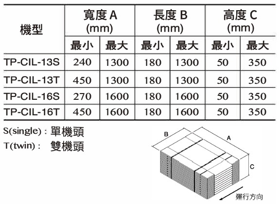 | 速度 | 可達24包/分 (型號: TP-CIL-13S 及 TP-CIL-13T) |